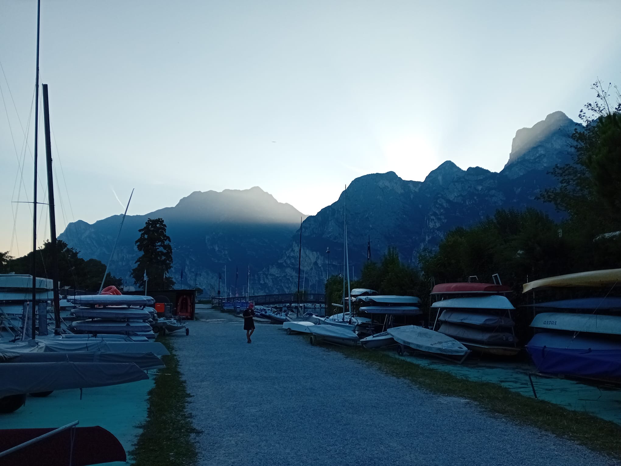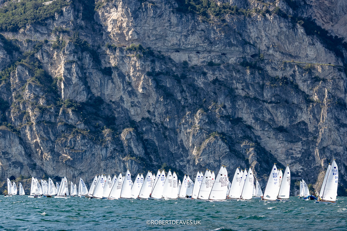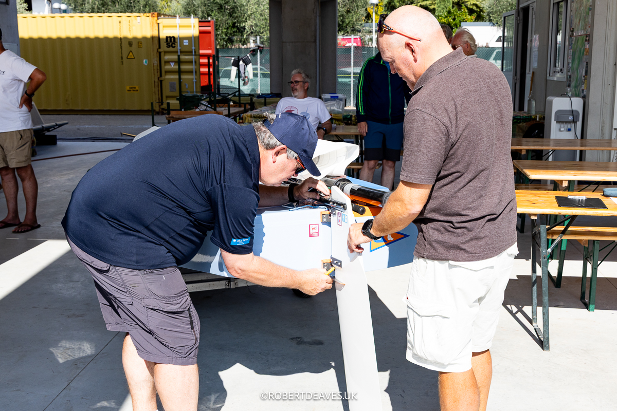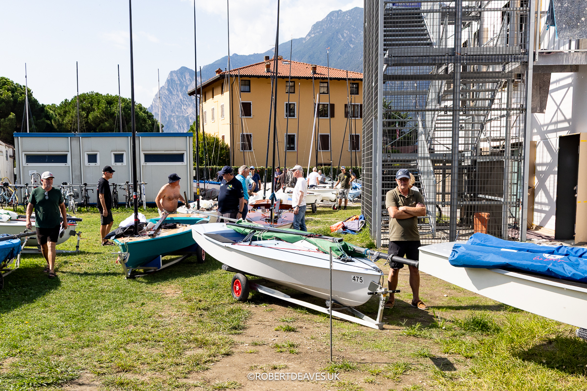 Zur WM reise ich dann etwas später am Freitagabend an, die Boote haben wir da gelassen und so muss ich nur schnell von München mit meinem Dachzelt nach Arco gondeln. Der Brenner ist eh keine Hochgeschwindigkeitsstrecke und man braucht eigentlich immer vier Stunden. Noch bei Innsbruck klingelt das Telefon, ein deutscher OK-Segler am Apparat: „Hast du Blei mit? Ich brauch 450g!“ Da hat der Profi doch glatt vergessen sein Packerl Blei wieder an den Mast zu bappen nach dem Lackieren. Das sind so Aktionen für die eigentlich ich zuständig bin. Ich weiß zwar nicht wie viele Felgen-Ausgleichsgewichte dran glauben mussten aber am Ende hatte er sein Blei.