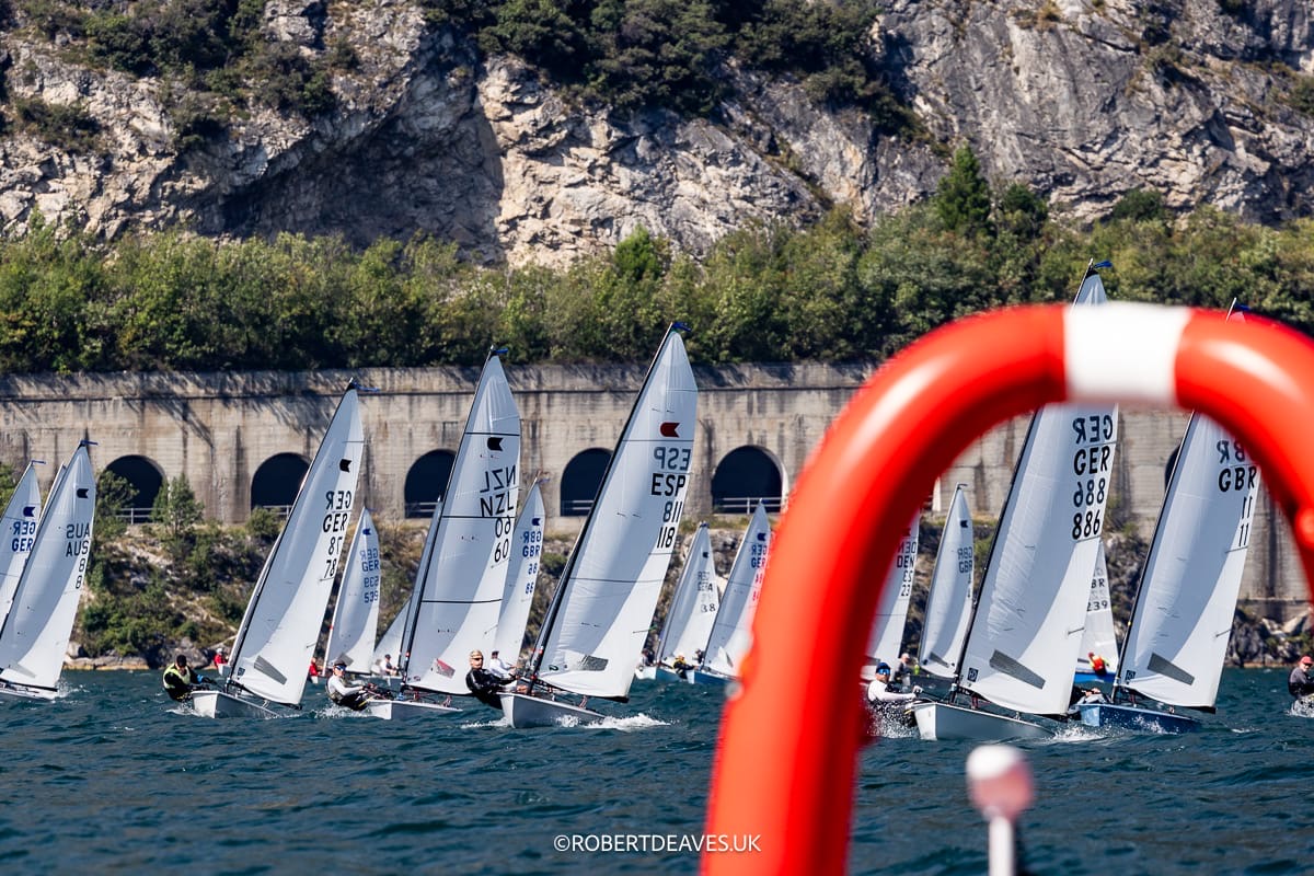212 Boote gehen an den Start in 3 Feldern. Für den ersten Tag wird nach Weltrangliste eingeteilt und an den folgenden Tagen nach den Vortagesergebnissen. Ich bin dann doch ein bisschen kribbelig und als die Ora kommt, will ich dann auch zeitig raus und mich einsegeln. Das geht auch alles recht problemlos und an den Sliprampen geht es dank der Helfer vom Club auch zügig ins Wasser. Allerdings hätte ich vielleicht mal bei der Steuermannsbesprechung zuhören und mal ans Masttop schauen sollen. Da weht nämlich ein rotes Bändchen, dritter Start, 1h30 Wartezeit nach dem ersten Start. Na gut, dann kann ich mir in Ruhe alle Starts anschauen und viermal hoch und runter fahren, bis es endlich losgeht.