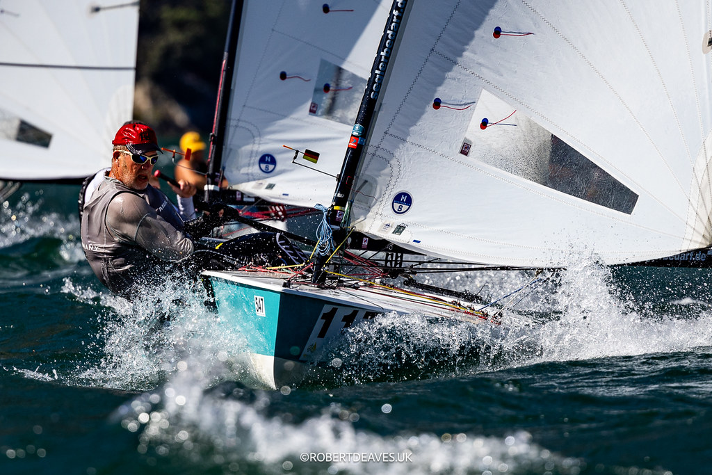 Auf dem langen Weg nach rechts lässt es dann Jan-Dietmar unter mir mal „etwas laufen“ wie er es später an Land bescheiden beschreibt. Und ich kann euch sagen, wenn Jan-Dietmar es laufen lässt, kannst du dich warm anziehen. Das ist das dritte Mal in der laufenden WM, dass er mich auf der Kreuz sauber nass macht. Ich lege mich schon wieder zu knapp unter die Lay-Line und will nicht hinter zwei Booten durchgehen. Habe ich erwähnt, dass mir das schon mal passiert ist? Zack sind wieder acht Boote drüber gezogen inklusive Charly, André und Ulli. Die Abstände unter den ersten 10 sind schon relativ groß und so komme ich trotz wirklich gutem Speed nur wenige Plätze nach vorne. An der Leetonne hätte ich fast die Überlappung zu André bekommen aber die letzten zwei Wellen erwischt er einfach zu gut.