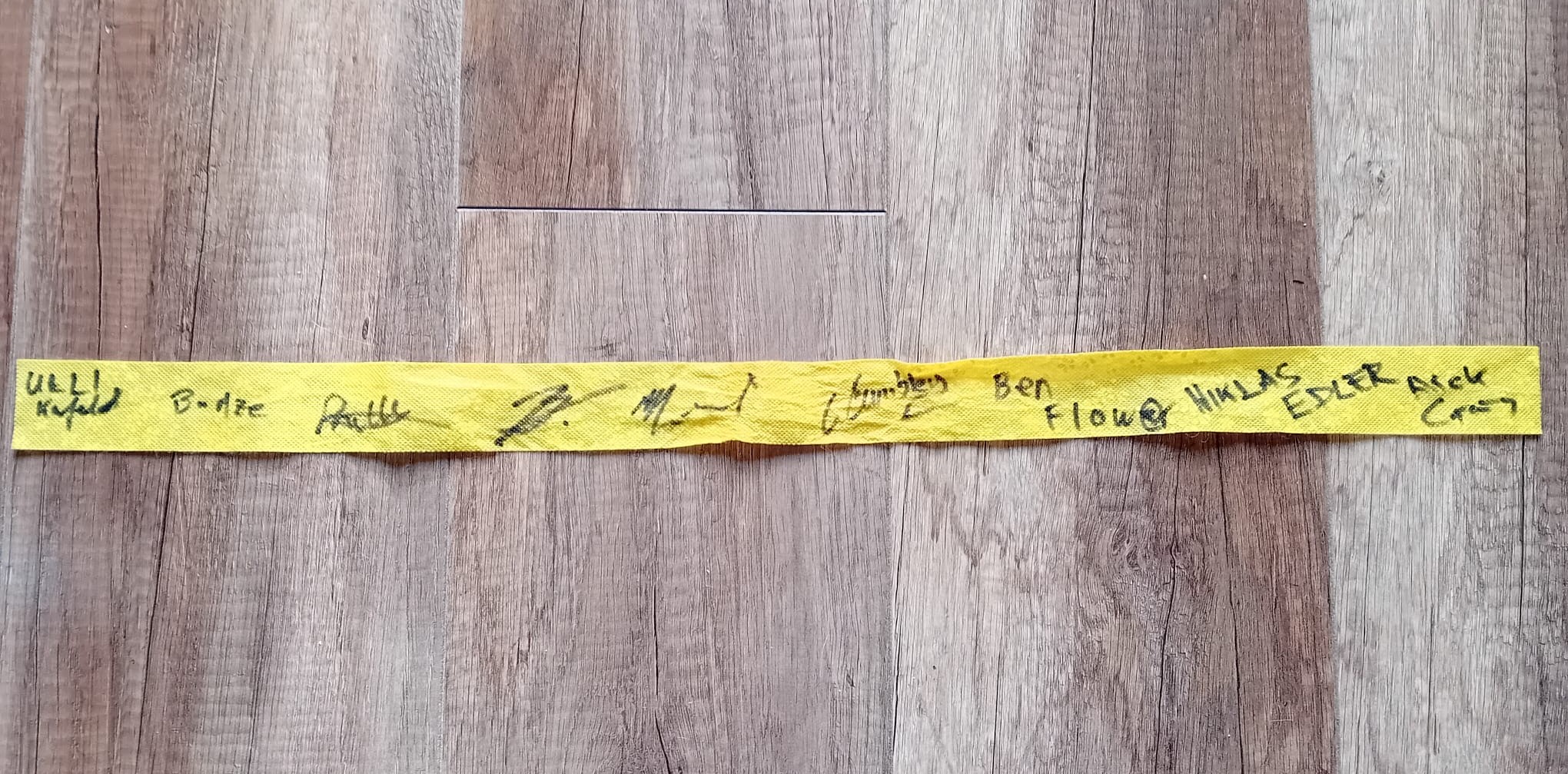Ich bin super zufrieden mit dem Gesamterlebnis für diese WM. Viele spannende Rennen, tolle Momente des Erfolgs, spannende Situationen unter hohem Druck, ein gutes Ergebnis und die vielen Gespräche mit netten Leuten aus aller Welt. Ich habe mich gut darauf vorbereitet und meine eigenen Erwartungen erfüllt. Ein bisschen desillusioniert bin ich von der großen Lücke ganz nach vorne. Dass die absoluten Topleute noch mal so viel besser sind, habe ich nicht gedacht. Aber man muss ja auch noch Ziele haben für die nächsten Jahre. Beim Abbauen fällt mir mein gelbes Goldfleet-Bändsel in die Hände und ich habe eine spontane Idee. Ich hole mir den Edding aus der Werkzeugkiste und sammele die Unterschrift von den Top-10-Leuten in der Gesamtwertung ein, als Andenken an meine erste OK- WM.